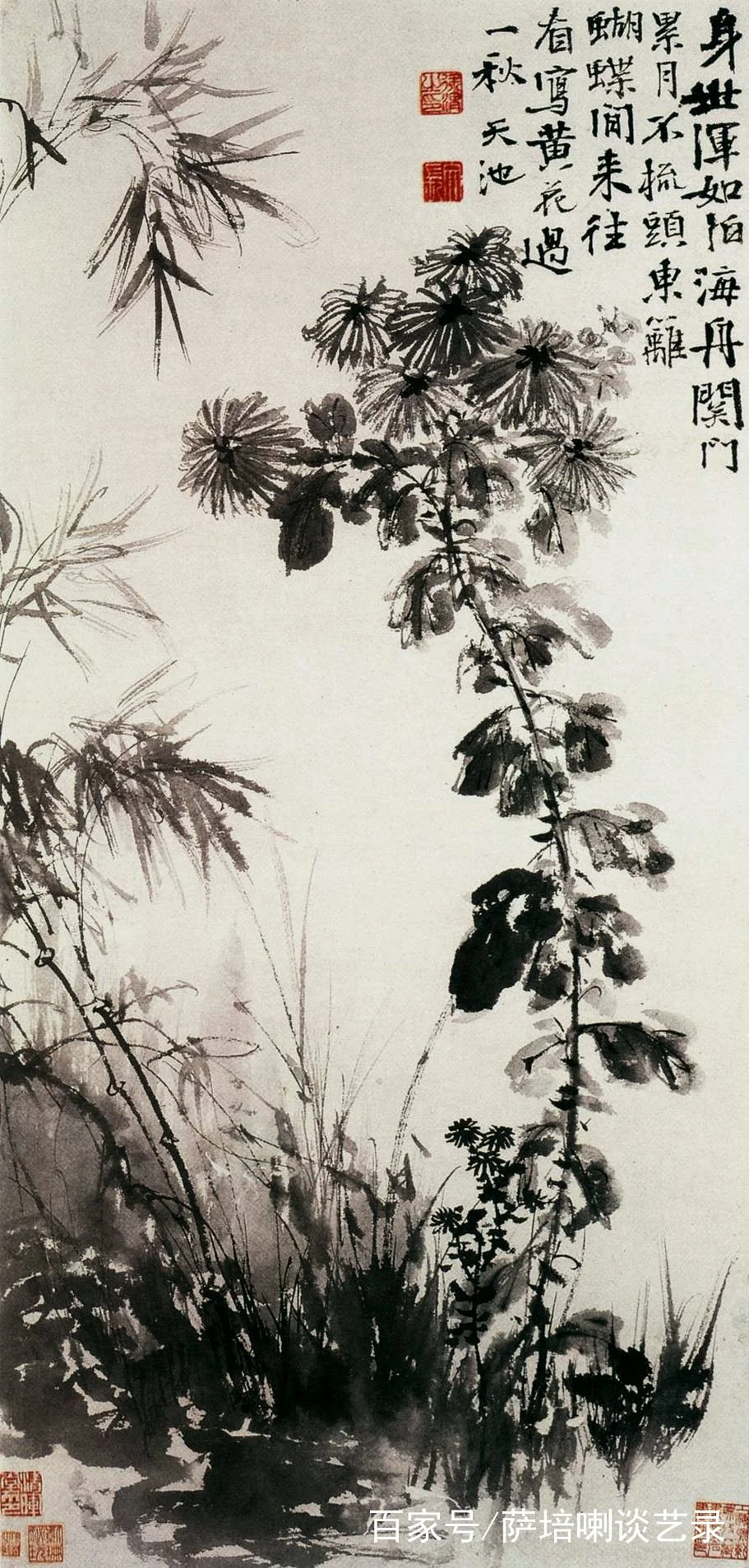 Xu Wei (徐渭) pushed the brush toward raw emotion. In works like Chrysanthemum and Bamboo, the lines edge toward wild cursive, forms fracture, and energy takes over—no longer calm, but unmistakably alive, a mind refusing to collapse under its own intensity.
